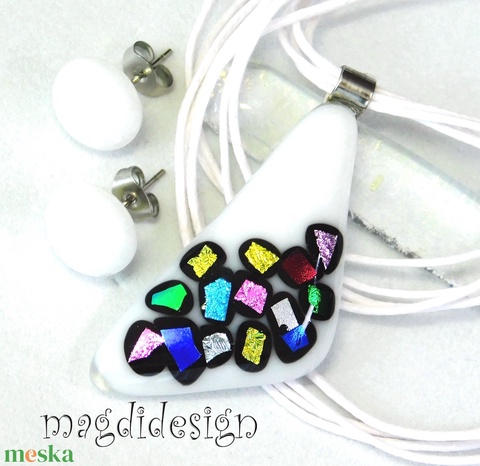 Fehér szivárványos dichroic bordűrös üvegékszer szett nyaklánc pötty fülbevaló