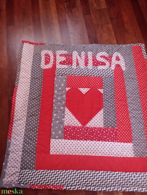 Patchwork / Foltvarrott babatakaró, piros szürke színben, Szívecske mintával és névvel ha szeretnéd