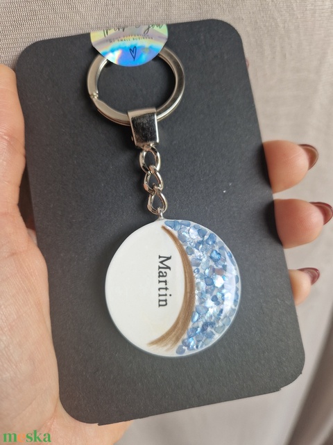 - Anyaga: műgyanta, szerelékek, lánc, csillám, hajtincs, kulcstartó alap