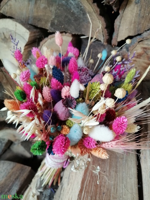 Színes szárított virágokból készült bohó menyasszonyi csokor