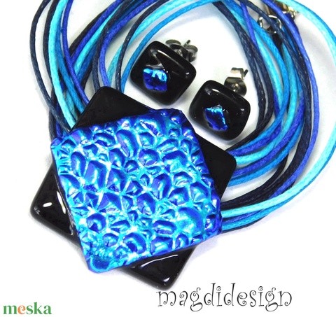Kék piramisok feketén üvegékszer szett, nyaklánc, stiftes fülbevaló