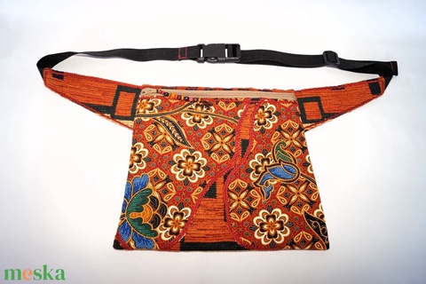 Rozsdabarna, narancssárga, virágos, batikolt, fesztivál övtáska, cipzáros övtáska indonéz batikolt pamutvászonból