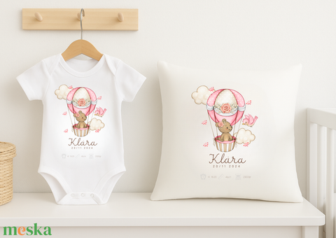 Személyre szabott keresztelő ajándékcsomag kislányoknak – Macis párnahuzat, body és születési poszter