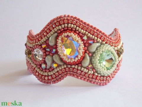 - Anyaga: japán kása, gyöngy, bőr, delica, aurora crystal, preciosa bicon, gemduo, zoliduo, preciosa crystal