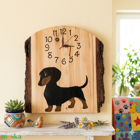 Nagyméretű fa falióra tacskó kutyussal díszítve