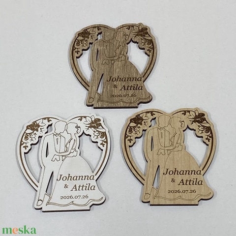 Esküvői köszönőajándék - gravírozott szív ifjú párral, talppal - ültetőkártya - hűtőmágnes