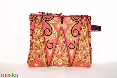 Bordó, barack, virágos, batikolt fesztivál tartóka, kozmetikai táska, cipzáros indonéz batikolt pamutvászon neszesszer
