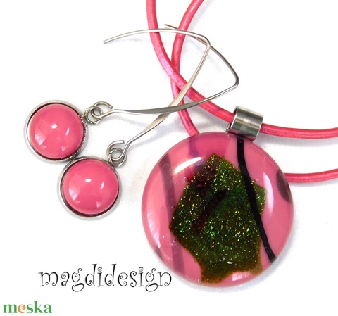 Mintás-mályvás-málna üvegékszer szett, nyaklánc, lógós fülbevaló