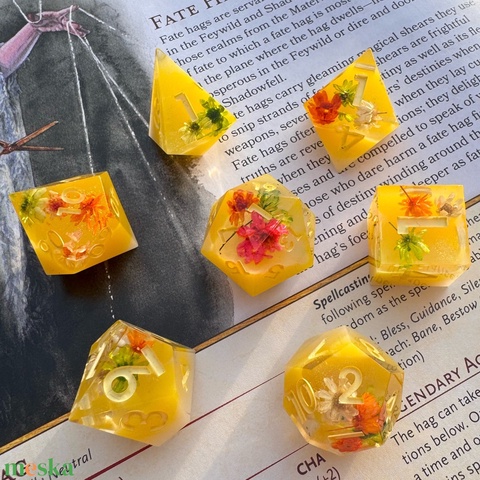A készlet 7 darab dobókockát tartalmaz, teljes mértékben kézzel készült, így került csiszolásra és polírozásra, új otthonába pedig egy fém dobozban, meglepetés mini őrző sárkánnyal érkezik!