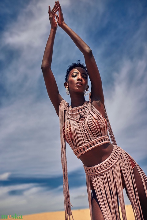 Két részes, kézzel csomózott, természetes alapanyagú bohém ruha
