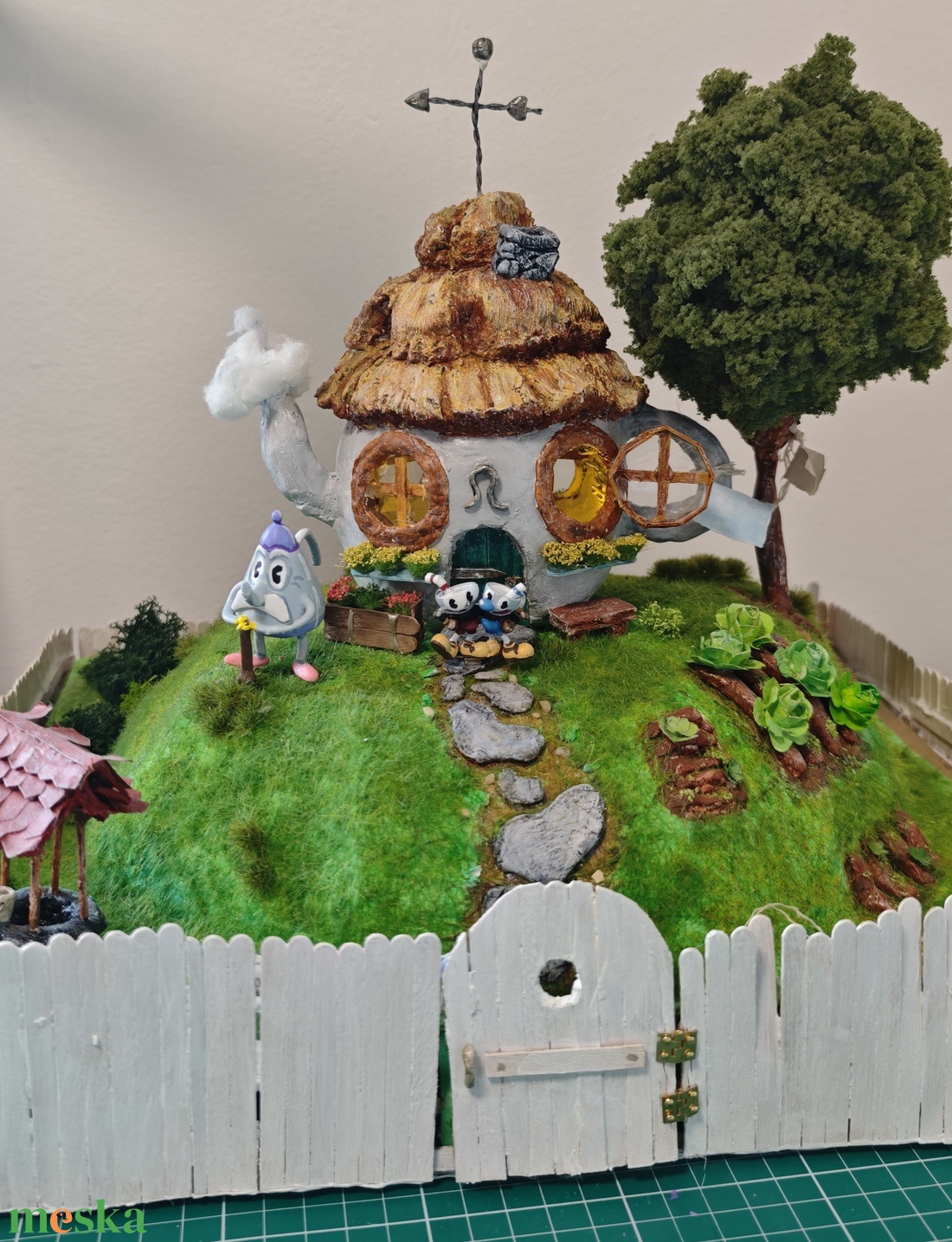Cuphead-ház (Csészefej és Bögrearc): mágneses, cserélhető figurákkal, LED fénnyel