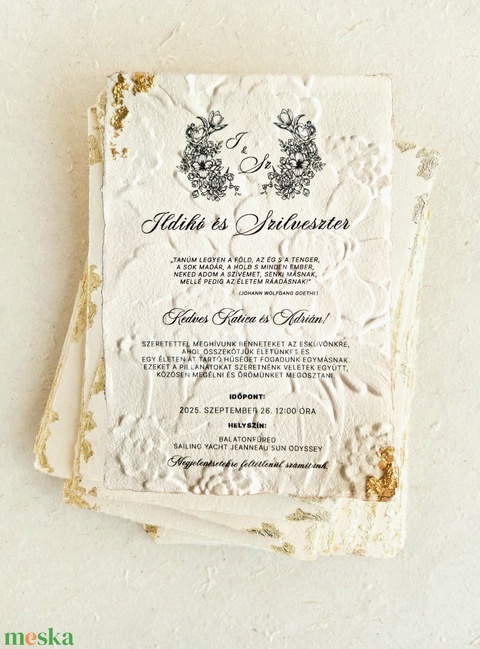Merített papírra készült, dombornyomott esküvői meghívó