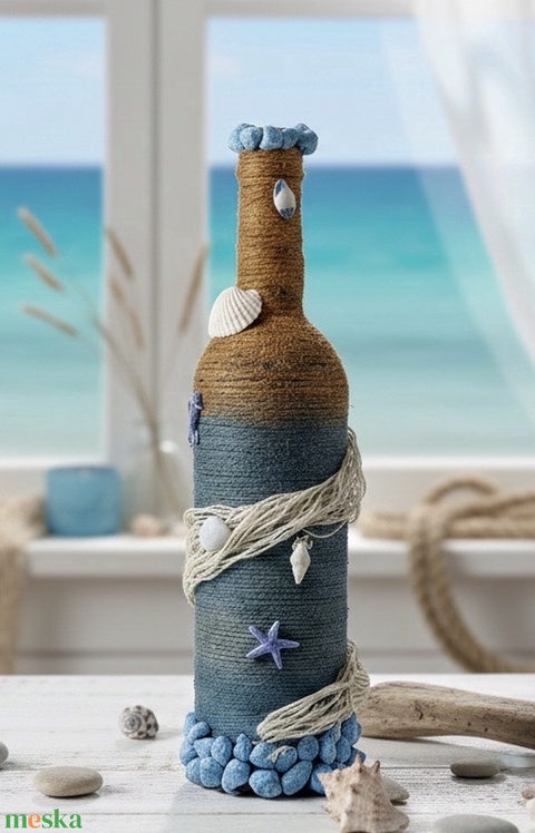 - Anyaga: akril, üveg, fonál, ragasztó, műanyag díszek, kagyló, háló, kövek