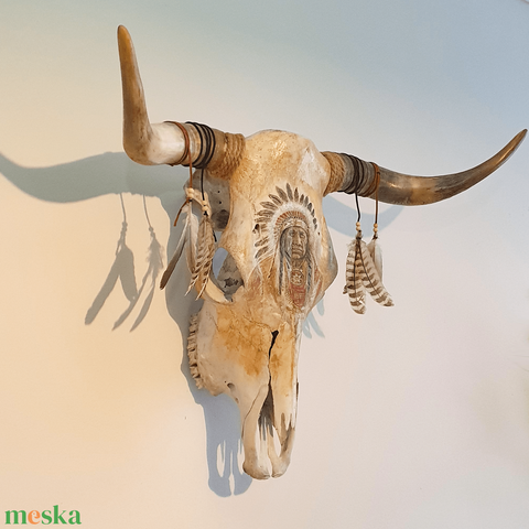 SavageSkullz Valódi tehén bika trófeára/koponyára dekorált indián arckép, kézzel festve és gravírozva