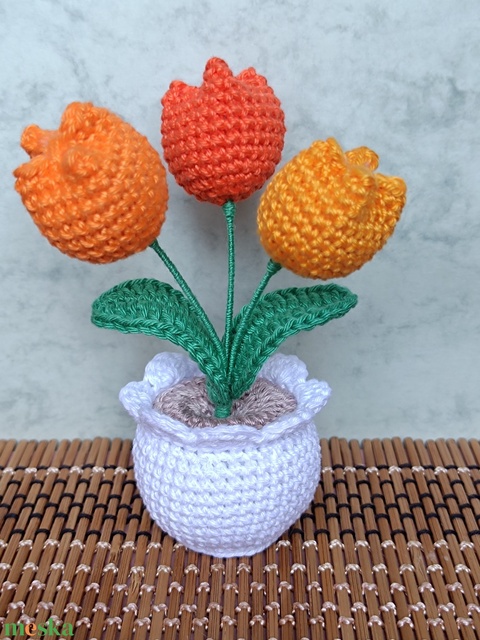 Horgolt tulipáncsokor kaspóban