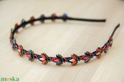 - Anyaga: japán kásagyöngy, cseh formagyöngyök, fém hajráf alap, japán cérna