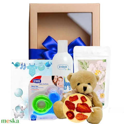 babafürdető olaj, gyümölcstea, csörgő vagy szundikendő, képeslap, plüssmackó, kézműves csokoládé, díszcsomagolás