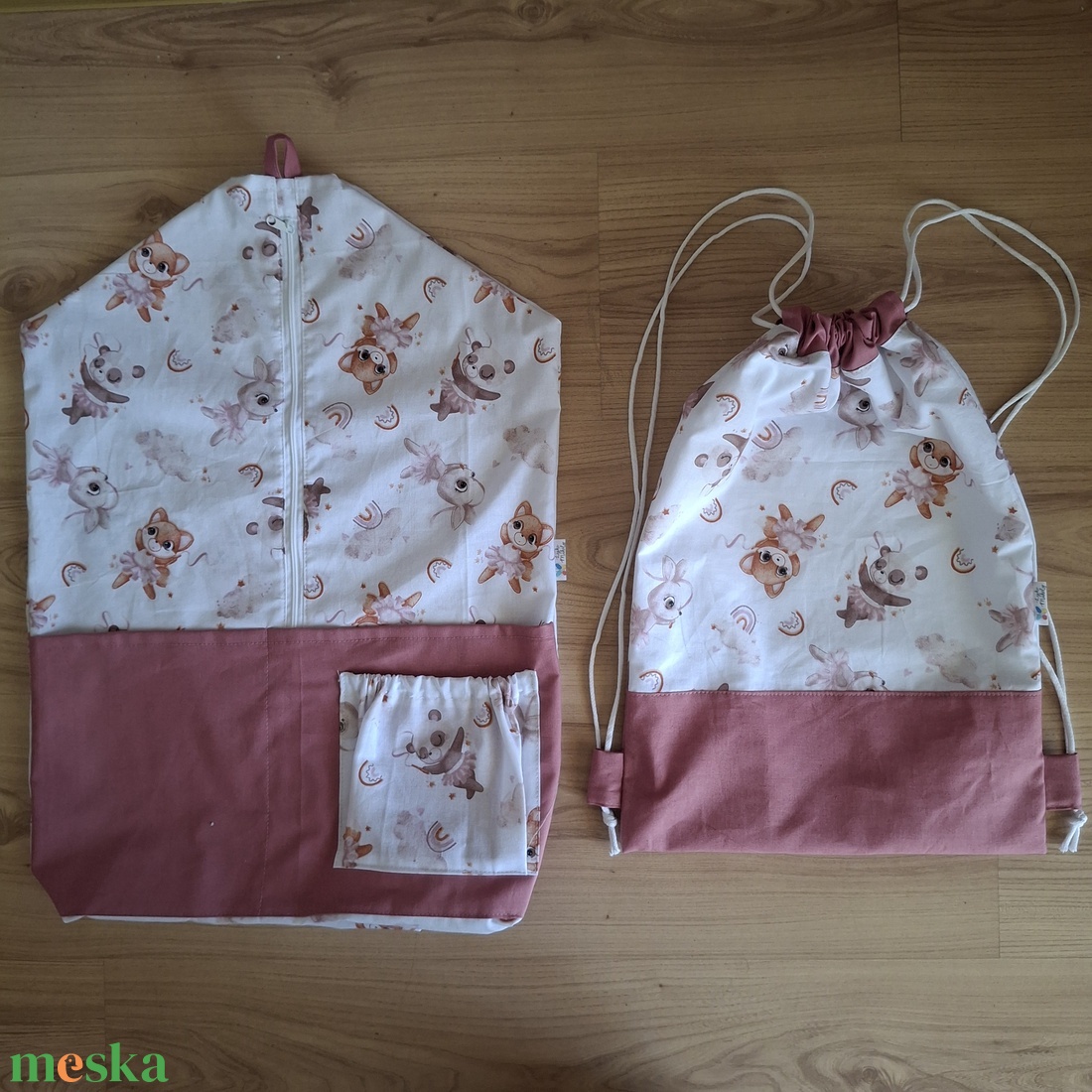 Mintás pamutvászonból készült. Méretei kb. 40×55 cm, cipzárral záródik. Elöl az egyszínű zseb kb. 20 cm magas, két rekeszre osztva. A mintás zseb felül gumírozott, kb. 16 cm magas és kb. 15 cm széles. Egy kis mélységet is adtam az aljának, hogy jobban pakolható legyen. Egy kisebb méretű felnőtt vállfa belefér.