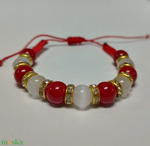 Koral ásványgyöngy, szelenit és aranyszínű zirkon köztesek felhasználásával készült egyedi karkötő a karácsony hangulatában. Egyedi, ünnepi viselet. Elnyűhetetlen viaszoszsinórral készült.