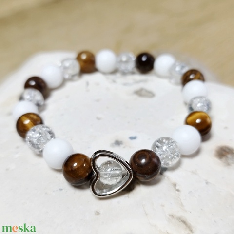 A barna tigrisszem segít csillapítani a szorongást, erősíti az önbizalmat és támogatja a tiszta, higgadt döntéshozatalt. A fehér achát kiegyensúlyozó, stabilizáló hatású, míg a hegyikristály felerősíti és letisztítja az energiákat.