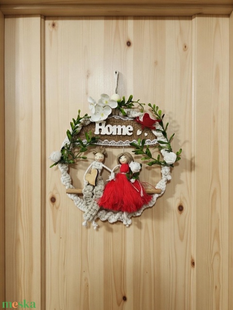 Romantikus makramé ajtódekoráció fiú-lány párral – „Home” ajtódísz
