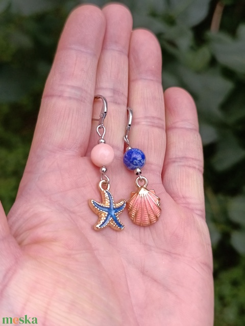 Fülbevaló lapis lazulival, rózsaszín jádeval, kagyló és tengericsillag dísszel