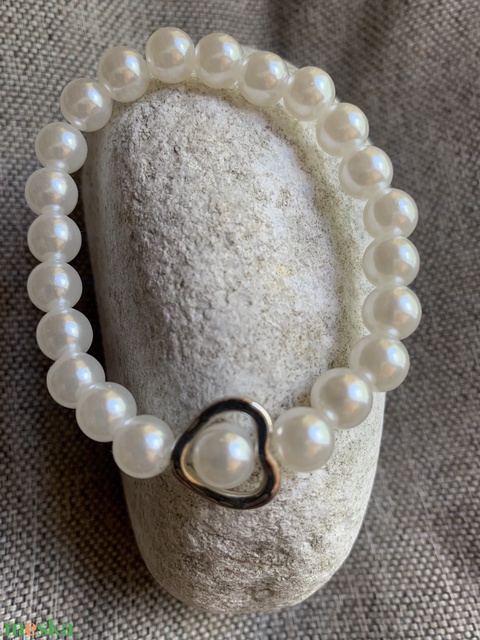 Hófehér 8 mm-es viaszgyöngyös karkötő szív alakú ezüst színű gyönggyel. Gumis karkötő