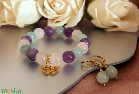 Akvamarin, ametiszt és rózsakvarc női ásvány karkötő pillangó medállal