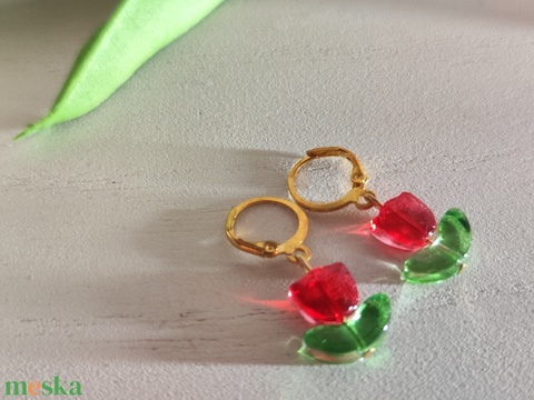 Cuki üveggyöngy piros tulipános fülbevaló – biztonsági kapcsos, arany nemesacél alap! 🌷