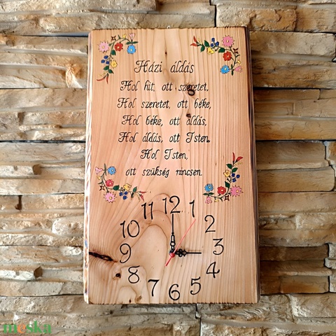 Nagyméretű, fából készült kézműves falióra magyaros virág mintával és Házi Áldással