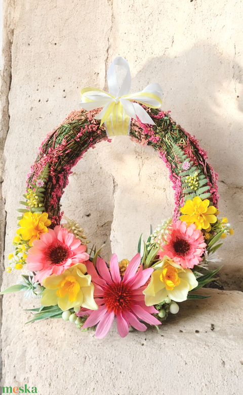 - Anyag/Összetevő koszorúalap, szatén szalag, termés, egyéb dekorációk, ragasztó, szárazvirág, élethű virág