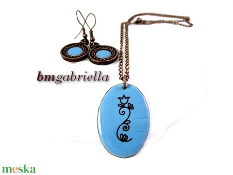 Tulipános ékszerszett- világoskék ovális tűzzománc nyaklánc és kerek lógós fülbevaló