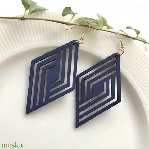 Fából készült fülbevaló, sötétkék rombusz mintával - Mesedoboz