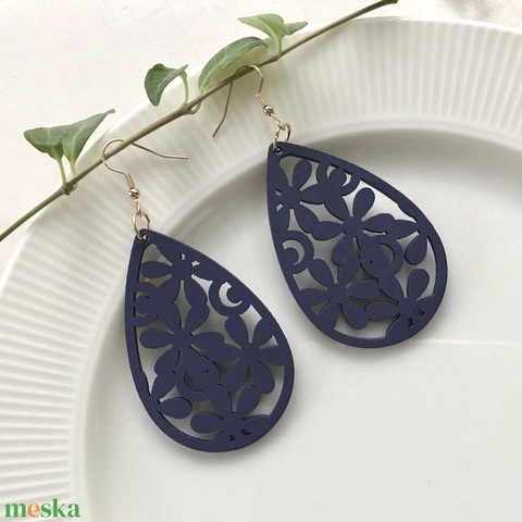 Fából készült fülbevaló, sötétkék levél és virág mintával - Mesedoboz
