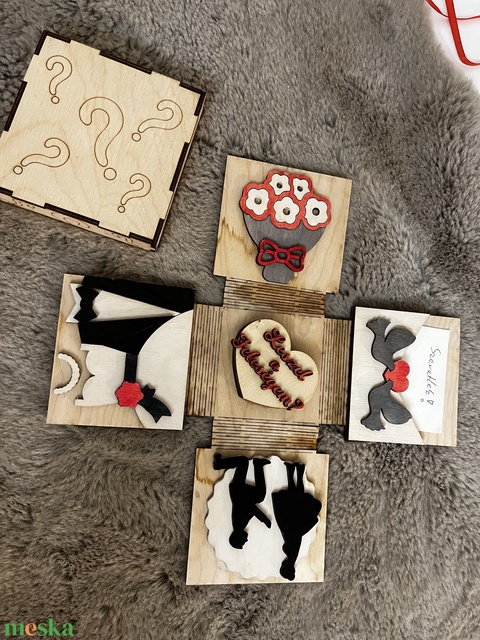 Romantikus, kreatív megoldás – A doboz kibontásakor minden oldal egy-egy szerelmes motívumot rejt, a középpontban a szív alakú rekesz és a gyűrű.