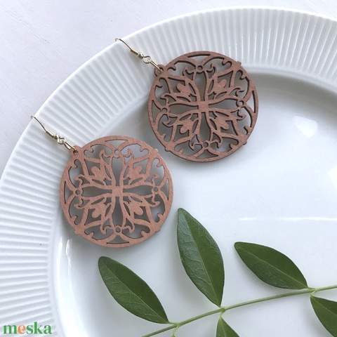 Természetes fa karika fülbevaló, áttört virág mintás - Mesedoboz