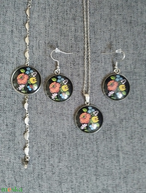 Üveg lencsés, orvosi acél nyaklánc és fülbevaló és karkötő szett népi motívummal
