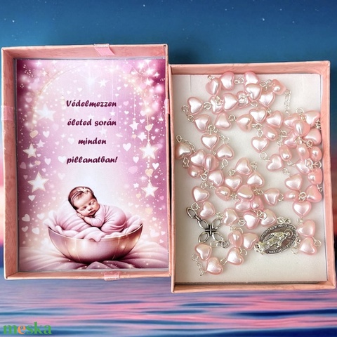 Keresztelő ajándék öttizedes rózsafüzér díszdobozban kísérő szöveggel lány gyermeknek 5588324