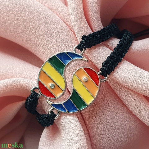 Fonott makramé barátságkarkötő, szivárvány színű, feng shui medállal