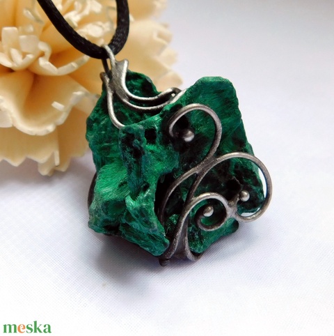 A medál Tiffany technikával készült nyers malachit, réz és ólommentes, ezüsttartalmú ón felhasználásával. A díszítés szintén saját készítésű, nem tartalmaz gyári elemeket. A fémrészt óezüstre patináztam és lelakkoztam, hogy sokáig szép maradjon.