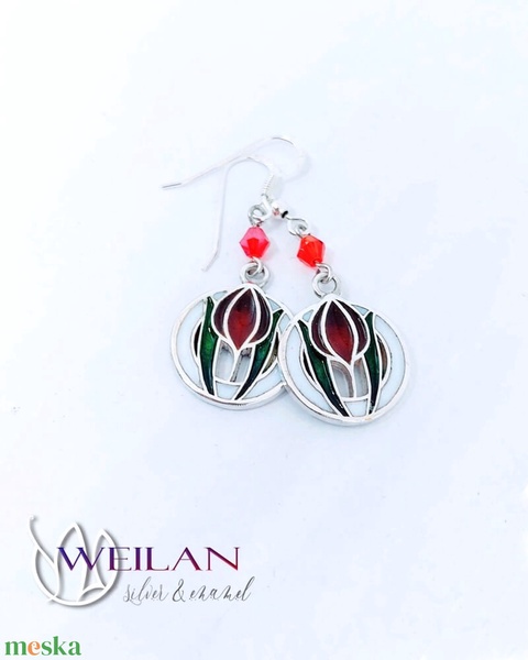 Hej' tulipán - Körtánc ezüst tűzzománc fülbevaló - piros-fehér-zöld