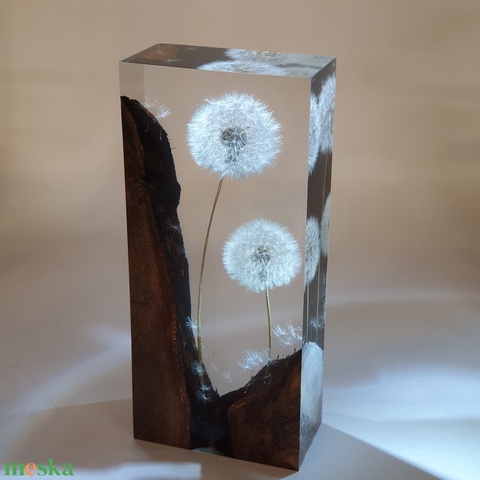 Kézzel készült pitypang dísztárgy gyantában, diófa gyökérrel, egyedi természetes ajándék