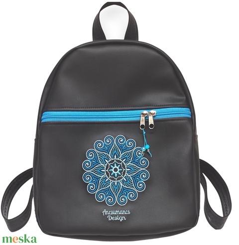 DORINA-L hátizsák - Hímzett mandalás, fekete-türkizkék, textilbőr pántokkal (mandala002)