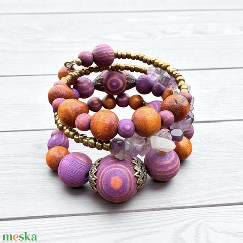 Fa és ametiszt szemekből készült rugalmas karkötő – a természetesség kedvelőinek! Erősebb lányoknak is ajánlom!