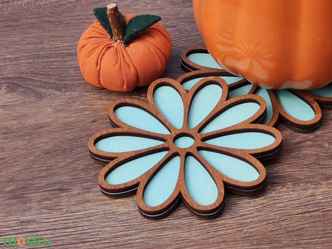Fa poháralátét szett (6db), virágmintával , tartóval