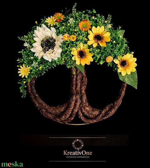Ez a kézzel készült, napraforgós élethű virágokkal és zölddel készült kopogtató a Te otthonodban is megújulást és az újjászületést szimbolizálhatja. A Tündérfa 30 cm átmérőjű fém karikán, akasztóval készült. Egyéni, kézműves termék.