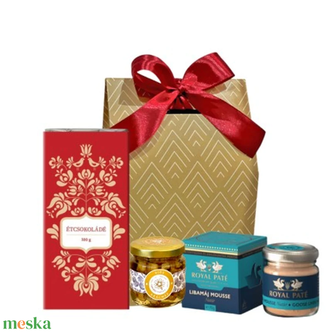 - Anyaga: libamáj, magyaros ajándékok, termelői diós akácméz, kézműves csokoládé