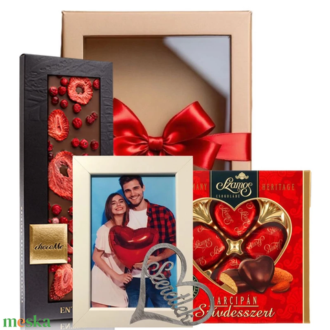 - Anyaga: epres csokoládé különlegesség, marcipán szívek, szív alakú fa tábla üzenettel, képkeret saját fényképpel