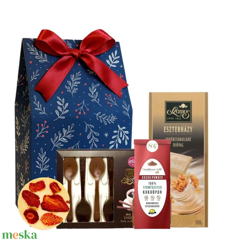 - Anyaga: karácsonyi kézműves csokoládé, díszcsomagolás, csokoládé kanalak, 100% természetes kakaópor