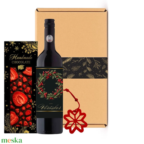 - Anyaga: karácsonyi kézműves csokoládé, díszcsomagolás, karácsonyi címkés száraz egri vörösbor